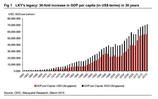It’s a hallmark in history. Lee Kuan Yew’s hard work and legacy for Singapore will continue to be a source of inspiration to many.According to a report by Macquarie Securities, in 1960, the first full year that LKY was Singapore’s prime minister, the city-state’s per capita GDP was US$428. By the time he left the PM’s office in late-November 1990, the island republic’s per capita GDP had increased almost 30-fold (29.8-fold to be more precise) in 30 years – to US$12,766. It was one of the most remarkable transformations -- and among the outstanding achievements -- in modern economic history. LKY stayed in government as Senior Minister and Minister Mentor for a further 20.5 years (until May 2011); during those two decades, Singapore’s per capita GDP increased another 4-fold to US$53,177 (in 2011) – for a spectacular 124-fold increase over 51 years. As the visionary founding leader of Singapore, LKY was instrumental in that transformation.