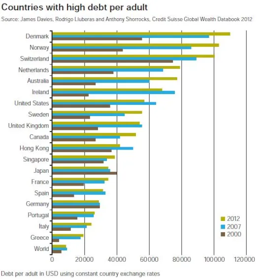 Countries with the highest debt per adult showed little tendency towards debt reduction in the aftermath of the financial crisis: Ireland, the USA and Hong Kong are the main exceptions.