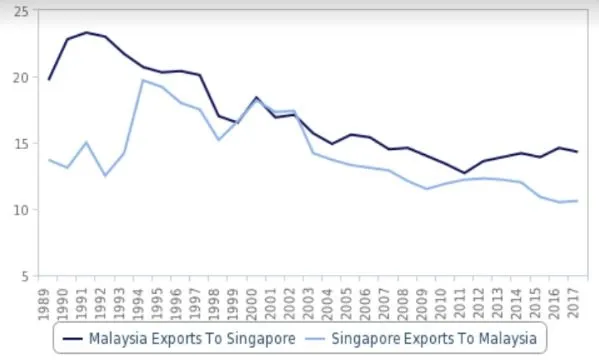 This chart from BMI Research shows that exports between Malaysia and Singapore have been on a downtrend over the last 30 years.