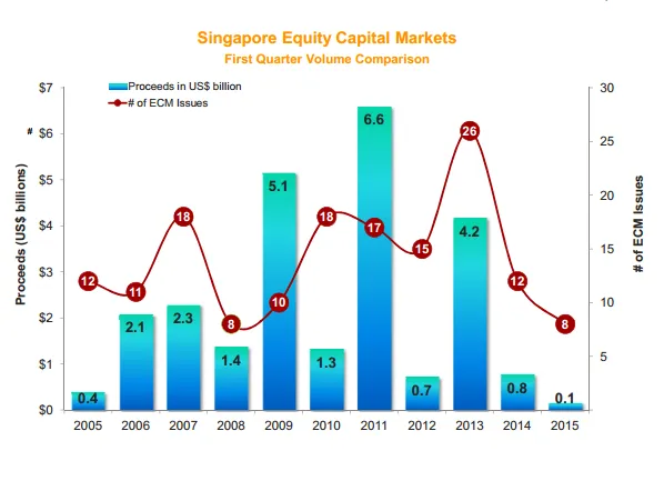 Singapore-domiciled companies tapping the equity capital markets (ECM) raised a total of $146.6 million so far this year, an 80.8% decline in proceeds compared to the first quarter of 2014 (US$764.8 million). This is the slowest start to a year since 2003 (US$73.4 million) for Singapore ECM activity.