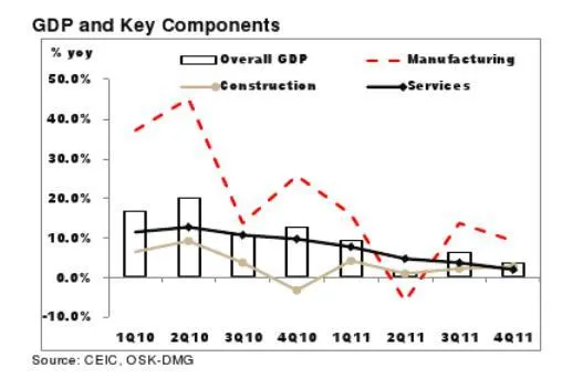 OSK-DMG Group Economics analyst Leslie Tang commented: “4Q11 GDP disappointed because we had thought that it would be upgraded because of stronger industrial production in Dec. Instead, the services sector growth was revised lower to 2.1% yoy in the quarter (+1.7 sa qoq) vs. the advance estimates of 3.2%, serving as a drag on growth in the quarter.”