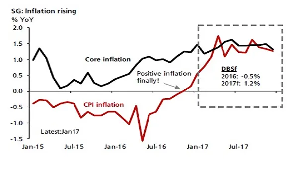 "Not only has inflation returned to the positive, the latest headline consumer price index (CPI) inflation for January rose to 0.6% on-year, up from 0.2% previously. Transport inflation was the key driver (2.8% on-year) amid the turnaround in global oil prices. Even core inflation has risen to 1.5% in the month," DBS said, noting that the rise will continue in the coming months.