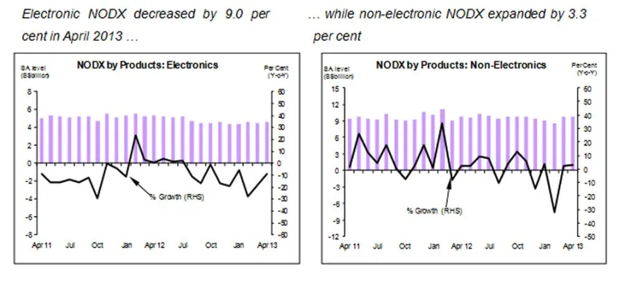 On a y-o-y basis, non-electronic NODX expanded by 3.3 per cent in April 2013, following the 2.3 per cent increase in the previous month. The rise in non-electronic NODX was led by printed matter (+130.8 per cent), petrochemicals (+19.3 per cent) and aircraft parts (+28.0 per cent).
