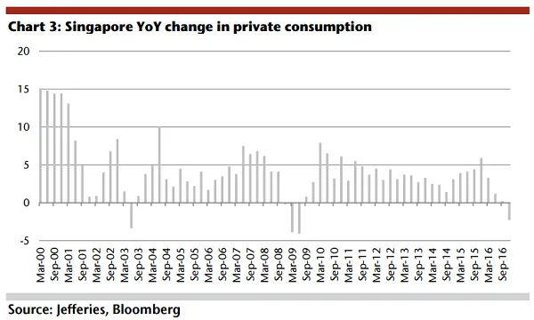Singapore private consumption declined in the past quarter even as GDP grew 2.9%. According to Jefferies, consumption declined 2.3% in 4Q16.