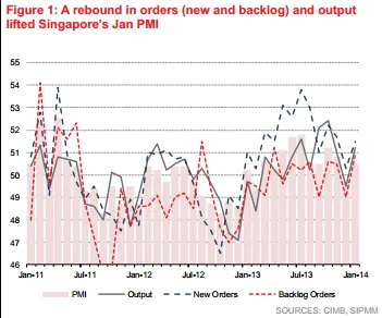 Singapore’s factories were busier in Jan 14 than in Dec 13, if its monthly PMI readings are any guide. The PMI recovered 0.8 pt to 50.5 in Jan, its best reading in three months, on the back of firmer orders (+1.2 pts to 51.5) and output (+1.7 pts to 51.2).