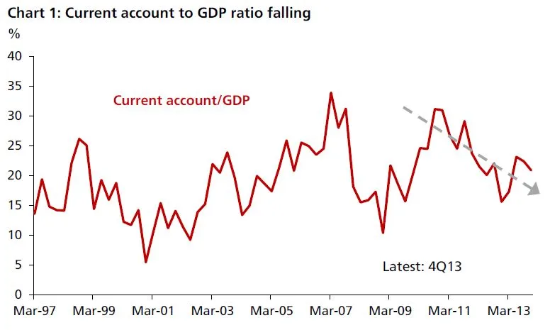 According to DBS, the current account surplus to GDP ratio has been falling. Latest current account surplus as of 4Q13 stands at SGD 17.4bn.