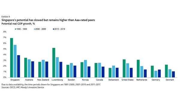 This chart from Moody’s shows that Singapore’s real GDP growth could still beat other top-rated countries such as Australia, New Zealand and the United States despite its dampening economy.