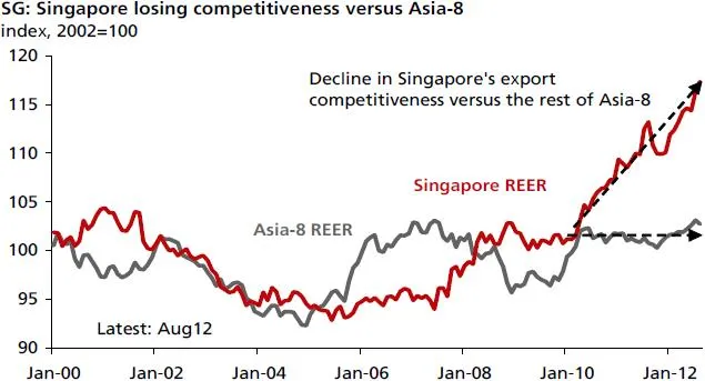 Singapore real effective exchange rate has continued to appreciate vis-à-vis regional peers due to a relatively higher domestic inflation as well as the strengthening of the Sing dollar. This inevitably hurts export and the manufacturing sector.