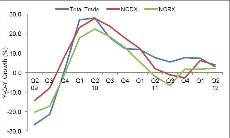 The second quarter of 2012 saw the stabilisation in growth for both total trade and NORX while NODX saw a second consecutive quarter of positive year-on-year (y-o-y) growth.