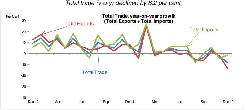 On a y-o-y basis, total trade contracted by 8.2 per cent in December 2012, following the 3.6 per cent decrease in the previous month.