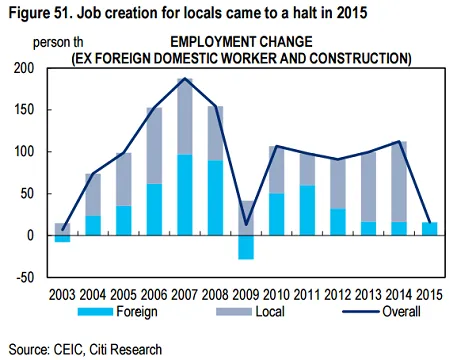 Overall employment growth in Singapore dropped drastically in 2015. This chart from Citi shows that only 31,800 jobs were created for the entire year, a far cry from the 130,100 jobs created in 2014. And out of these 31,000 new jobs, virtually zero was for locals.