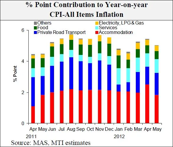In comparison, the increase in private road transport cost picked up from 8.2% in April to 10.3% in May on account of a sharper spike in COE premiums and, hence, car prices. Together, accommodation and private road transport costs accounted for close to two-thirds of CPI-All Items inflation in May.