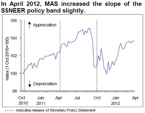 Accordingly, MAS kept the S$NEER policy band on a modest and gradual appreciation path in April 2012. However, the slope of the policy band was increased slightly, with no change to the level at which it was centered. MAS also restored a narrower policy band. This measured adjustment in the policy stance will continue to anchor inflation expectations, ensure price stability over the medium term, and keep GDP growth on a sustainable path.