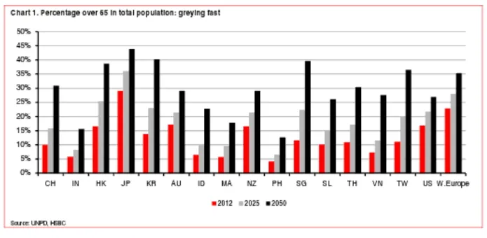 The chart from HSBC shows that proportion of over 65 year olds in the populationtion is set to double if not triple across Asia, except in Australia, New Zealand and Japan (where it is already high).
