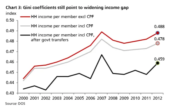Despite efforts to lower the Gini coefficient (from 0.488 down to 0.459) via government transfers in 2012, the Gini coefficient risen significantly since 2011. Hence, expect policy measures to continue to focus on narrowing the income gap in this budget.