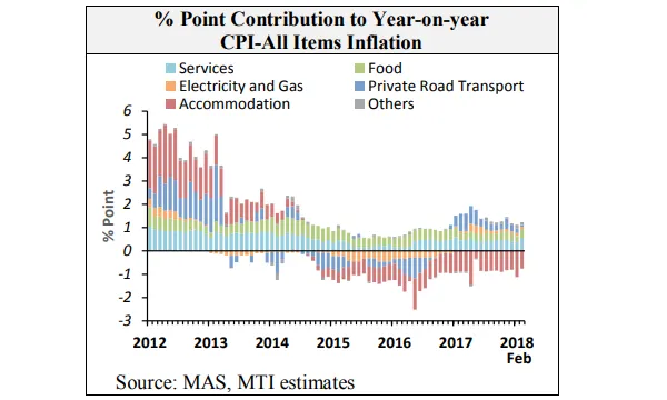 MTI noted that inflation, as measured by CPI less imputed rentals on owner-occupied accommodation (OOA), was 1.5% in February, up from 1.0% in the previous month. “Apart from higher services and food inflation, this was also due to the increase in the cost of housing maintenance & repairs, as the negative contribution of the S&CC rebates to year-ago inflation dissipated in February,” the ministry said.