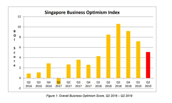The outlook for local businesses continued to be on the downtrend for the third consecutive quarter in Q2 2019 as the Business Optimism Index (BOI) moderated further from +7.19ppt in Q1 2019 to +5.08ppt, according to Singapore Commercial Credit Bureau (SCCB).