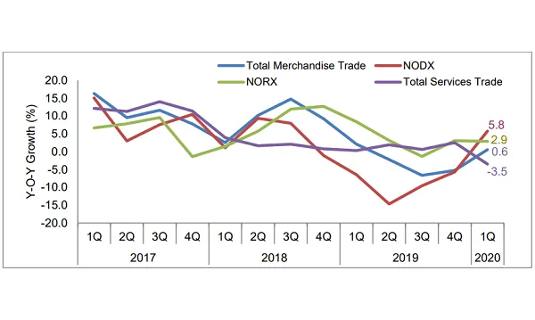 Non-oil domestic exports (NODX) reversed the decline in the previous quarter as it edged up 5.8% YoY in Q1 from the 5.7% dip in Q4 2019, according to data from The Enterprise Singapore (ESG).