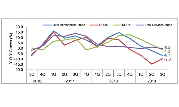 With exports unlikely to recover by the end of the year, Enterprise Singapore has adjusted its forecasts for year-end the total merchandise trade between -4.5% to -4%, and NODX to between -10% and -9.5%, respectively. For 2020, growth projections fall between 0% to 2% for both.