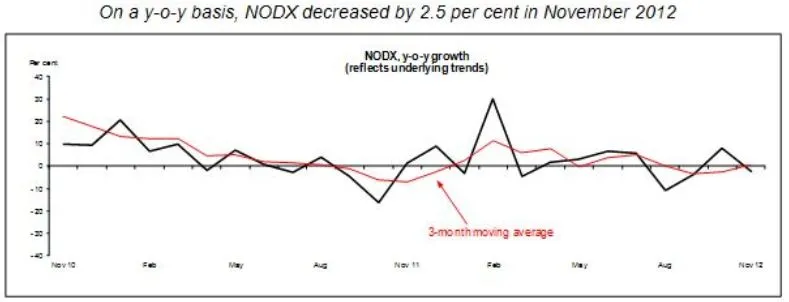 On a 3-month moving average (3MMA) y-o-y basis, NODX expanded marginally by 0.4 per cent in November 2012, compared to the 2.6 per cent decline in the previous month.