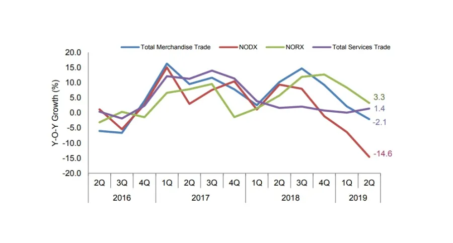 On a QoQ basis, NODX declined by 5% in the second quarter, larger than the 4.8% decrease in the previous quarter. Electronic NODX fell by 10.8% QoQ in Q2 from 16.8% QoQ decrease in Q1; whilst non-electronic NODX slipped 3.3% QoQ in Q2 after the 0.4% QoQ contraction in Q1.