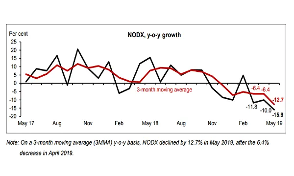 The NODX decline for non-electronic products widened to 10.8% from 8% in April. Civil engineering equipment parts (-92.4%), non-monetary gold (-72.4%) and petrochemicals (-14.7%) contributed the most to the dip in non-electronic NODX.