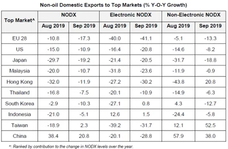 Singapore’s non-oil direct exports (NODX) declined for the seventh consecutive month by 8.1% YoY in September amidst a slow global demand and trade war tensions.