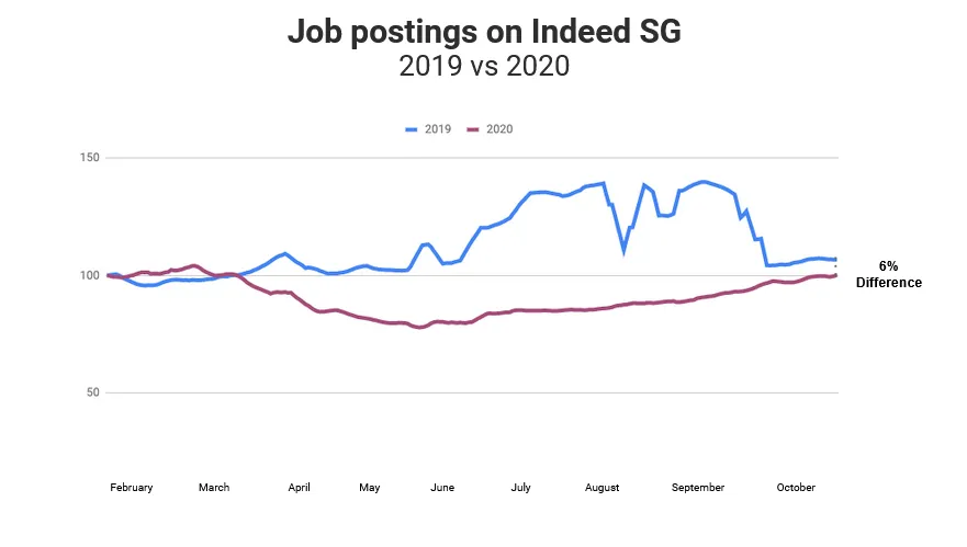 New Singapore data from global job platform Indeed shows overall job postings are recovering, being only 6% behind where they were in the same period last year.