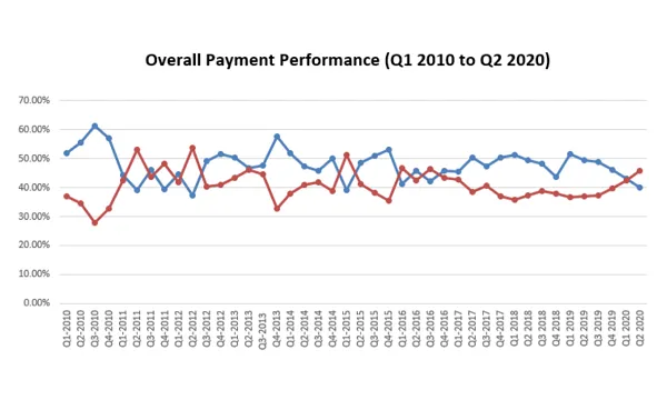 Prompt payments fell 3.11 percentage points (ppts) QoQ and 9.35 ppts YoY from 43.2% in Q1 to 40.09% in Q2. Slow payments likewise inched up 3.2 ppts QoQ and 8.68 ppts YoY to 45.78% in the same quarter.