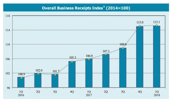 Business receipts of the services industries, excluding wholesale & retail trade and accommodation & food services, grew by 8.5% YoY in the first quarter of 2018.