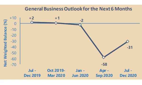 This results in a net weighted balance of 31% of firms predicting a less favourable business outlook in H2. Though the business outlook remains negative, the figure is more relaxed compared to the -58% recorded in Q2.