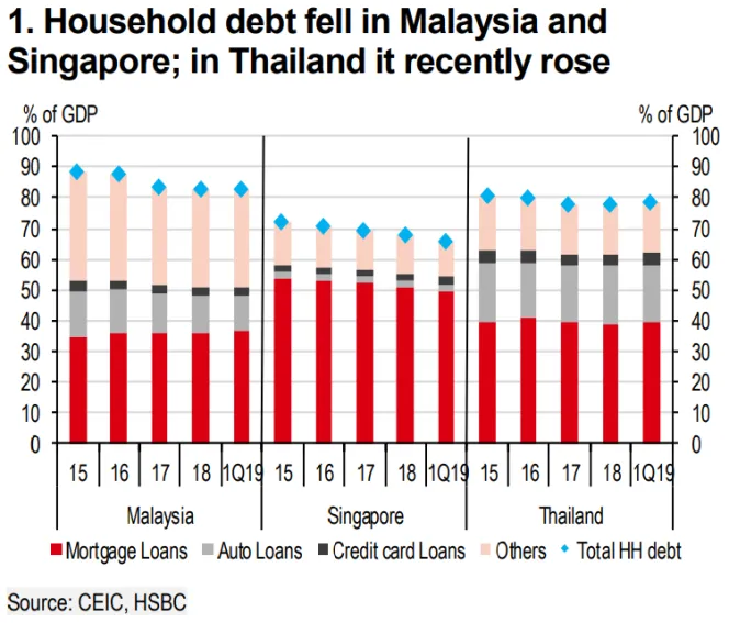 In Q1 2019, household debt as part of Singapore’s GDP already fell below 70%. In Malaysia and Thailand, the levels still play at around 80%. According to HSBC, a weaker housing market has allowed households in Singapore, Indonesia, and Malaysia to deleverage.