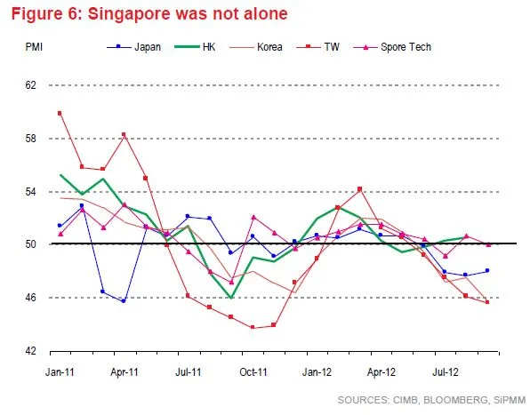 According to CIMB, headwinds are aplenty for trade-dependent Singapore, including recessions in Europe and the slowdown in the US. Singapore’s manufacturing weakness in Sep/3Q12, it said followed similar patterns across export-oriented Asia, with Japan, Korea and Taiwan all in contraction mode for the fourth consecutive month.