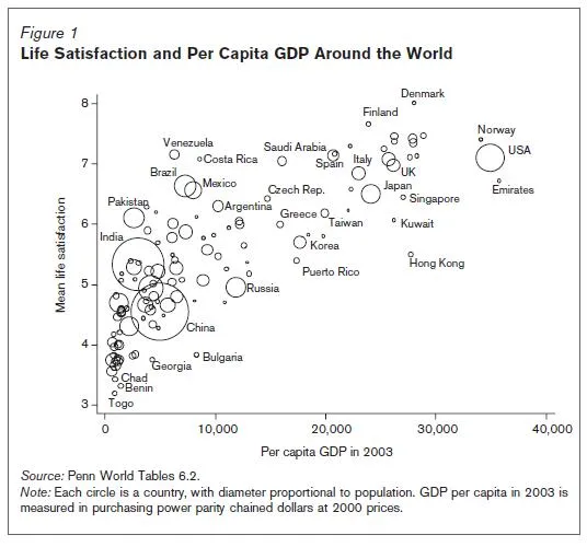 [The figure below] summarizes information about the relationship between life satisfaction and national income. The horizontal axis is per capita GDP in 2003 (the nearest year for which there is complete data in the Penn World Table) measured in purchasing power parity (PPP) dollars at 2000 prices. Each circle is a country, with diameter