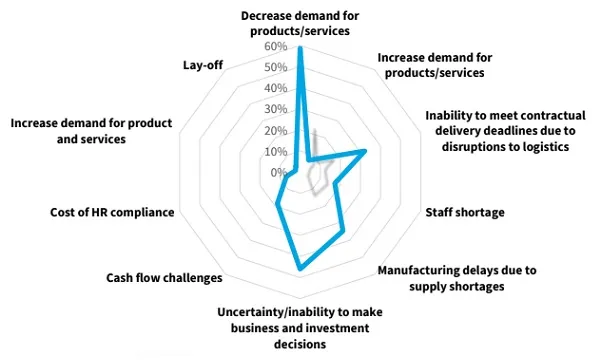 Nearly three in five or 59% of respondents experienced decreased demand for their products and services, whilst 46% felt uncertainty or inability to make business and investment decisions. Over three in 10 or 32% dealt with an inability to meet contractual delivery deadlines due to disruption to logistics.