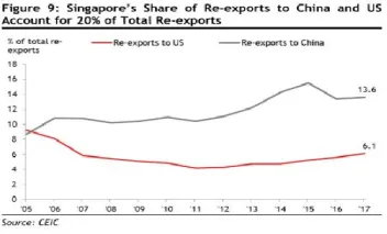 Singapore's re-exports is exposed to trade war impacts as 20% of it go to China and US.