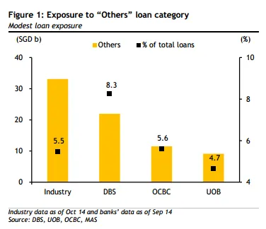 Based on broad definitions, we gather that DBS’s exposure is less than 10% of its loans. Assuming OCBC’s oil & gas loans are also lumped under others, its maximum exposure should be 5.6%.