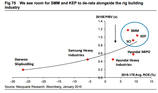 This chart from Macquarie shows that Sembcorp Marine and Keppel Corporation are still valued higher than their Korean peers, such as Daewoo, Samsung Heavy Industries, and Hyundai Heavy Industries.