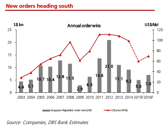 This chart from DBS shows that total order wins for Keppel and Sembcorp will amount to just $5b this year, the lowest since $2.9b during the Global Financial Crisis.