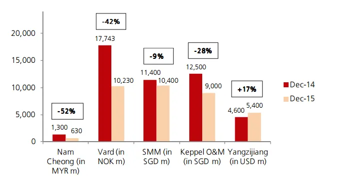 Large order wins were few and far between for Singapore's largest shipbuilders in 2015. This chart from DBS shows that most builders endured a sharp decline in order wins last year, on back of the prolonged offshore oil and gas downturn.