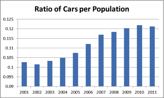• The COE, and it's refinement over the years, is controlling the number of cars added to the roads. In Figure 1 we are able to illustrate that the significant increase in ratio (i.e. more cars per population) from 2002 has reached a plateau from 2007 with a slight downward trend in 2011.