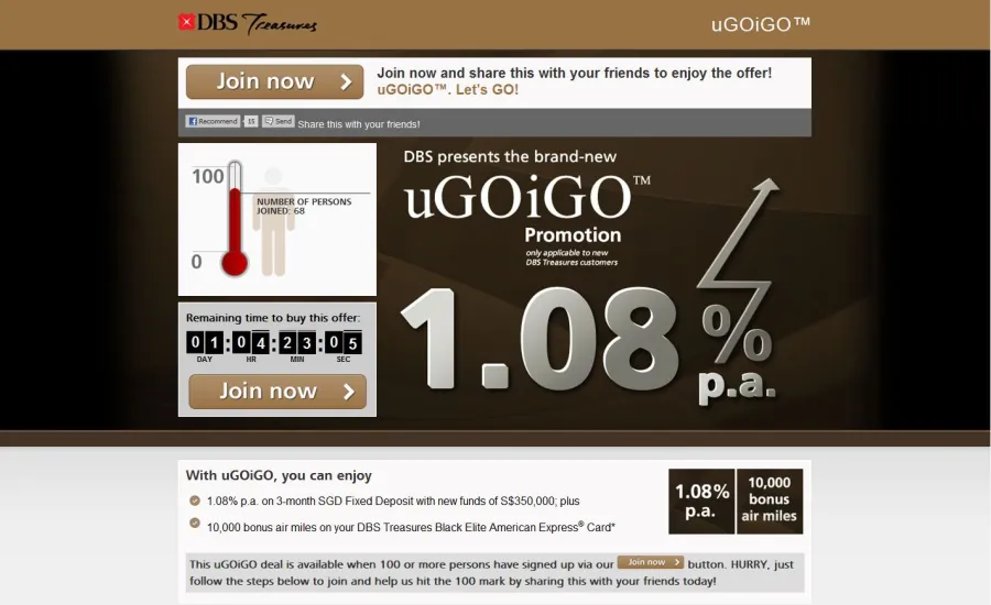 The innovative campaign is called uGOiGOTM and is part of the bank’s efforts to further engage its customers in the social media space. The initial deal was launched on 18 March 2013 (Monday) and offered new DBS Treasures customers the opportunity to enjoy interest of 1.08% per annum with a three-month fixed deposit of SGD$350,000. Within five days, it reached the 100% target as customers shared the deal with their peers online.