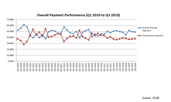 Slow payments, which refers to when less than 50% of total bills are paid within the agreed terms, rose slightly by 0.19 ppt QoQ to 37.29% in the same quarter from 37.1% in Q2 2019. On a YoY basis, it fell by 1.65 ppt from 38.94% in 2018 to 37.29% in Q3 2019.