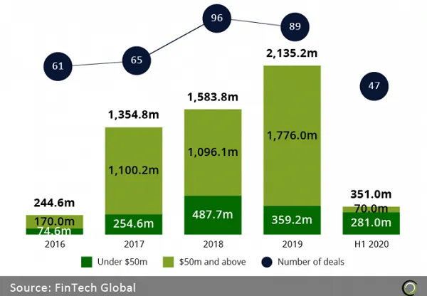 The pandemic and the economic fallout that ensued triggered the fall, as just over 19.9% of total investment for the first-half year came from deals sized over $50m, a measly figure compared to H1 2019 where deals above $50m made up 92.5% of total investments for the period. Firms have only recorded a single deal over $50m so far, compared to six in 2019.