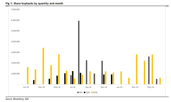 Meanwhile, OCBC has bought back 60% of the volume it bought in 2018 and much earlier, the analyst added, noting that the DBS and OCBC buybacks in Q2 2019 are equivalent to 55% and 53%, respectively, of their treasury shares balances.