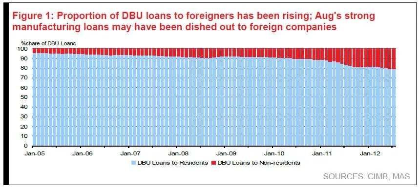 We think that the strong manufacturing loan growth could be related to foreign borrowings given the relatively low interest rates for S$. If sustained, loan growth could go to low teens, potentially exceeding local banks’ loan growth guidance.