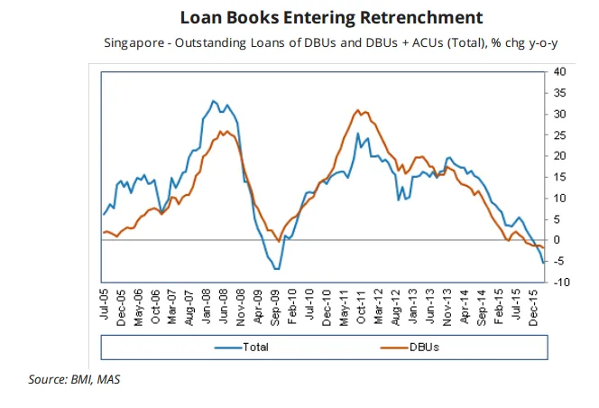 Singapore's banking sector is experiencing retrenchment after years of rapid credit growth. This chart from BMI Research shows that there has been a decline in total outstanding loans from both Domestic Banking