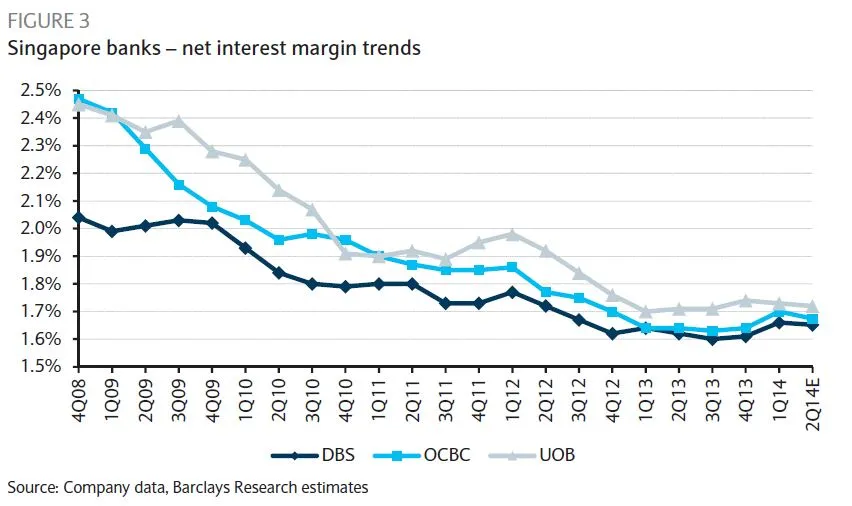 We expect modest margin pressure (down 1-3bps q/q), largely driven by lower interbank rates and easier liquidity conditions in China which could put pressure on China-related loan, interbank and investment securities yield especially for DBS and OCBC, which benefited from sharp margin expansion in 1Q14.