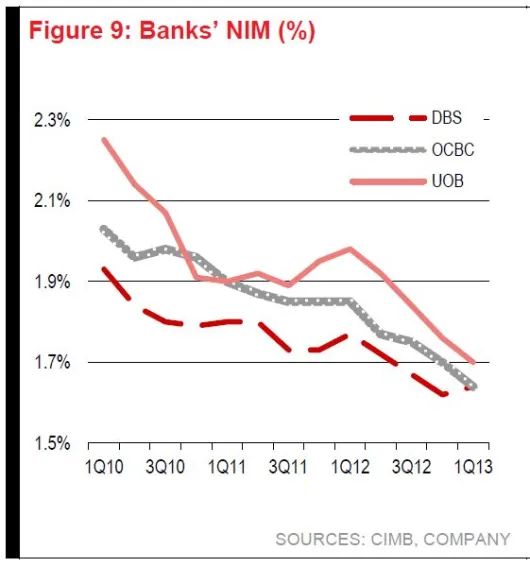 CIMB said that NIMs for UOB and OCBC were down 6bp. Both blamed it on lagged mortgage re-pricing. OCBC said that 40% of its margin squeeze derived from this and guided that the pressure could persist in future quarters.