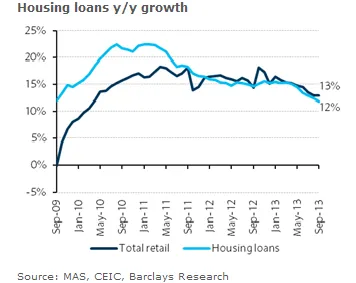 According to Barclays, Singapore's housing loans slowed to 0.7% m/m (vs 1.6% m/m in August) and 7.7% ytd, as MAS’s fine tuning of housing loan-to-value limits in late June and the introduction of a 60% Total Debt Servicing Ratio (TDSR) cap, in a bid to further strengthen credit underwriting standards, affected mortgage growth.